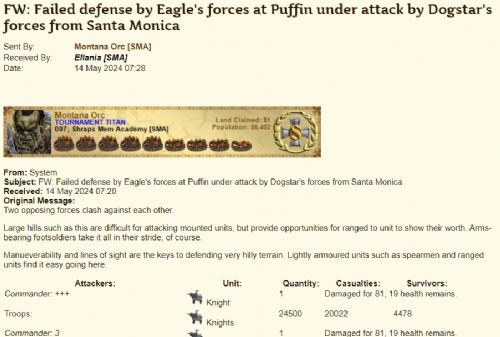 I never said nor implied any of those statements. Just more propaganda, misinformation and lies on your side. I pointed out obvious mistakes on your side - but that does not mean you "can't handle yourself" and have "no knowledge of game mechanics". As an example there are quite a few Iron/RE players that are using elite setups well. But lets get back to facts: Iron/RE cleared Eagles city on 14 May 2024 07:28 - proof: ![]() Note: The report is quite long thus i am only showing the in my opinion important part. I can share the whole report if needed. This failed defense also killed our siege on King Sigerius city. Iron/RE remote siege was setup at 15 May 2024 00:54 - proof: ![]() Between the clear and the raze we had multiple defense armies arriving - but those got cleared multiple times. Lets look at your statements: